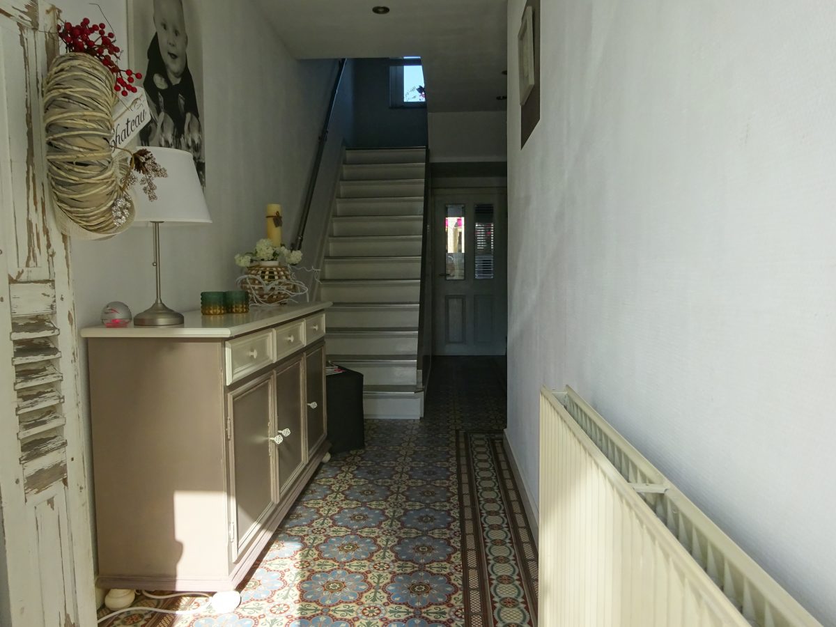 Entree/hal met meterkast, zeer mooie tegelvloer en toilet met hangcloset. Ruime woonkamer ( 7,12 x 3.27 m) met laminaatvloer. Separate eetkeuken ( 5.14 x 3.46 m) met dubbele tuindeuren naar overdekt terras en tuin. De keuken in hoekopstelling is voorzien van de volgend apparatuur, 5 pits gas kookplaat, elektrische oven, afzuigkap en koelkast. Deur keuken naar bijkeuken ( 2.75 x 2.07 m) met de opstelling van witgoed en vaatwasser